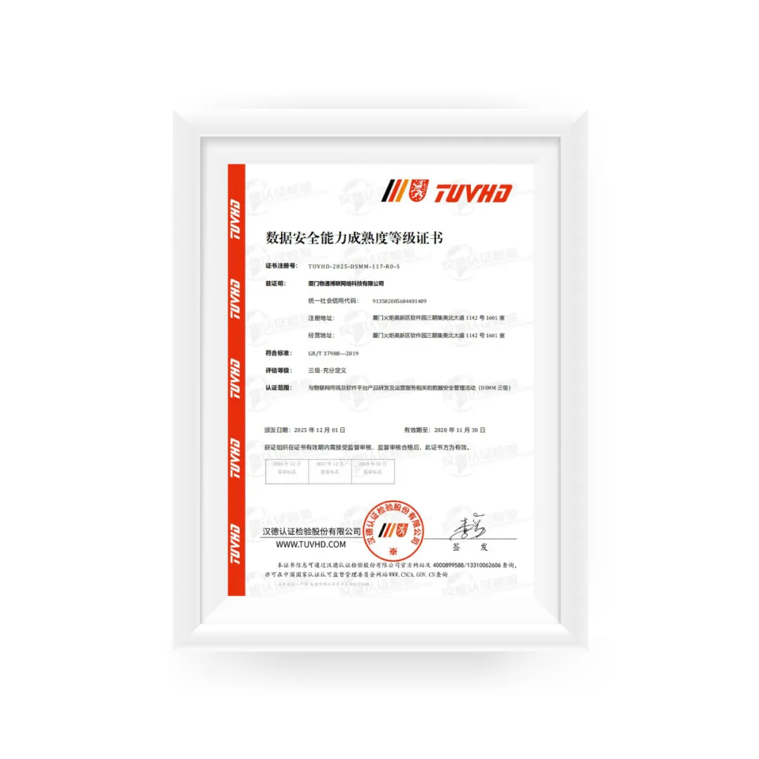近日,廈門物通博聯網絡科技有限公司(簡稱:物通博聯)成功通過數據安全能力成熟度(簡稱“DSMM”)三級認證,標志著公司在數據安全管理與保護領域達到了行業先進水平。