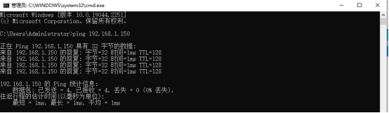 1、將PLC與網(wǎng)關(guān)通過LAN口相連接,通過設備快線(維護通道搭建成功后)在遠程電腦上使用cmdpingPLC的IP地址(192.168.1.150為PLC的IP地址)
