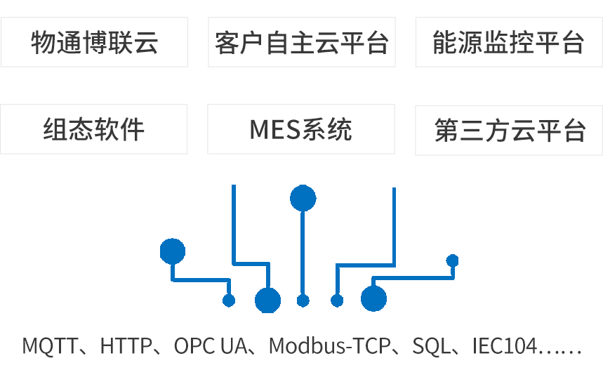 北向支持接入物通博聯云平臺,客戶自主開發的云平臺,第三方云平臺(根云、美云、華為、阿里、百度、微軟等IOT云平臺),能源監控平臺等