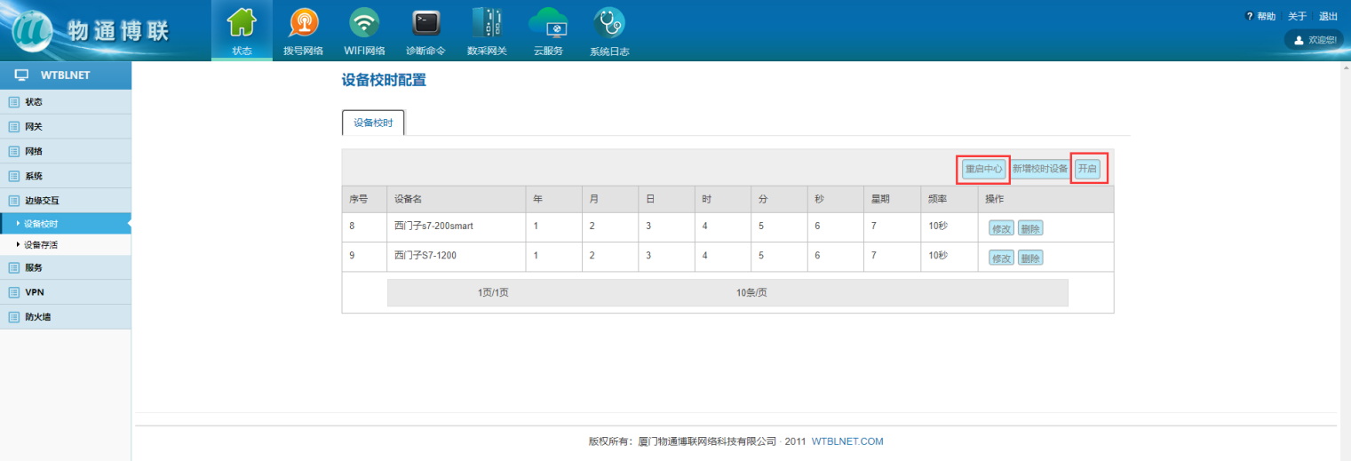 點擊“開啟”按鈕(注意:當(dāng)該設(shè)備校時功能處于關(guān)閉狀態(tài)時,該按鈕顯示開啟,反之顯示關(guān)閉);點擊“重啟中心”按鈕,等待提示成功,使配置生效。