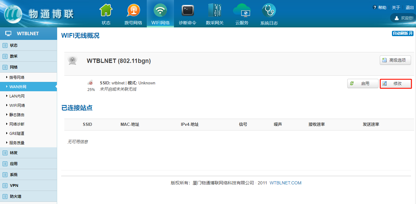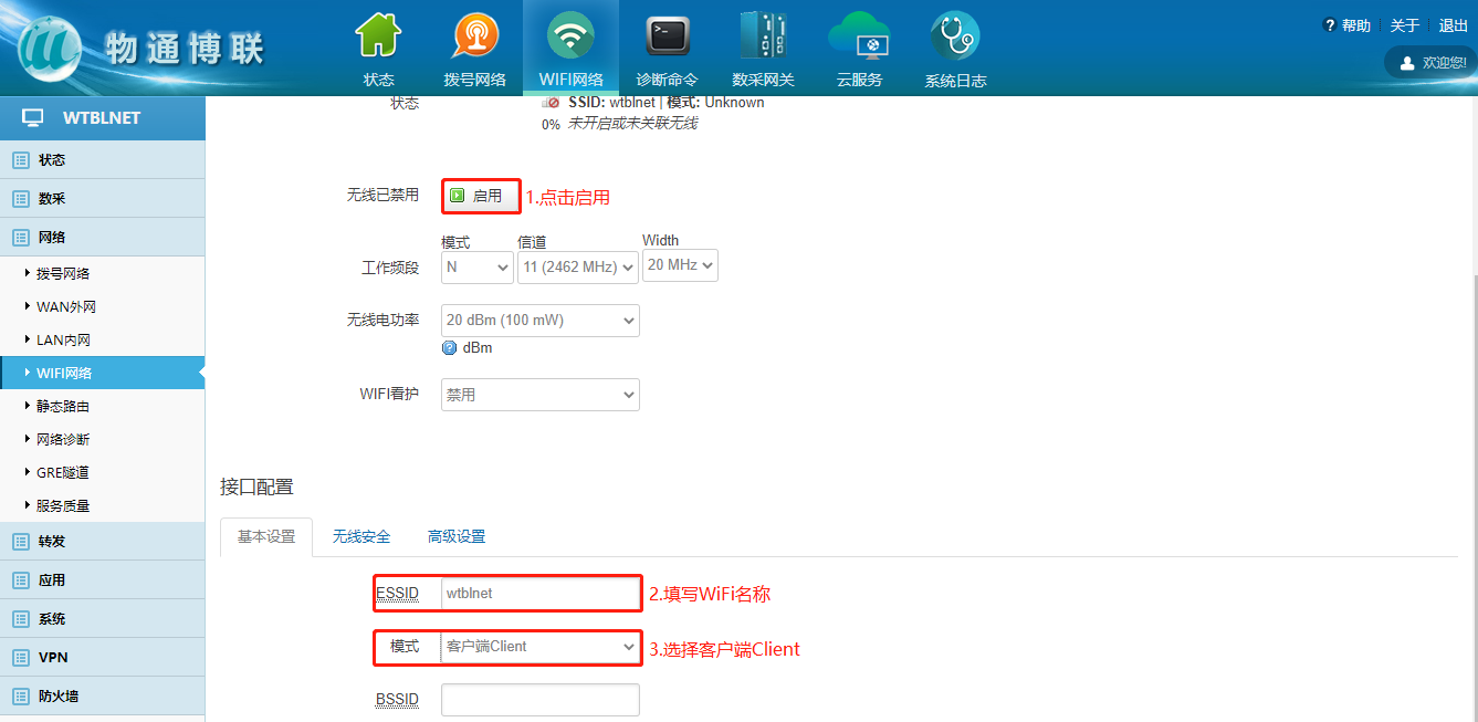 下載中心 視頻中心 常見問題 售后服務 工業網關 設備快線 數據云平臺 聯網設備 問答百科 工業智能網關如何連接wifi熱點? 時間:2022-10-26 09:15:30 點擊:6516 關鍵詞:工業智能網關,wifi 問題:工業智能網關如何連接wifi熱點? 回答: (1)電腦通過網線接入到網關LAN口,瀏覽器輸入192.168.2.1默認地址 (2)登陸網關配置界面選擇WiFi網絡 (3)點擊WiFi界面修改—進入WiFi配置界面 (4)啟用WiFi—填寫ESSID(WiFi名稱)—模式選擇客戶端Client (5)點擊無線安全—輸入WiFi密碼 注意:WiFi獲取到的IP網段與網關LAN口的IP網段不能重復! 上一篇:工業智能網關如何更新程序和固件? 下一篇: 工業智能網關如何使用流量卡上網?