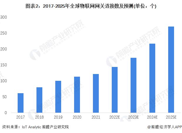 據(jù) IoT Analytic 數(shù)據(jù)顯示,截至 2021 年末全球物聯(lián)網(wǎng)連接數(shù)為 122 億,同比增速接近 8 個百分點。同時,根據(jù) IoT Analytic 的預測,預計到 2025 年,全球物聯(lián)網(wǎng)網(wǎng)關連接數(shù)將達到 270 億左右。