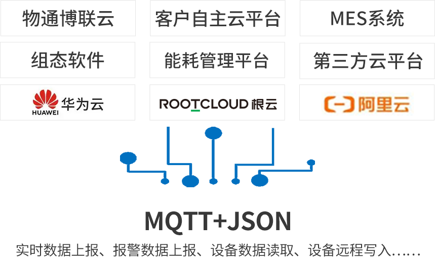 北向支持MQTT協議接入物通博聯云平臺,客戶自主開發的云平臺,第三方云平臺(根云、美云、華為、阿里、百度、微軟等IOT云平臺),組態軟件、MES系統、ERP系統等工業軟件
