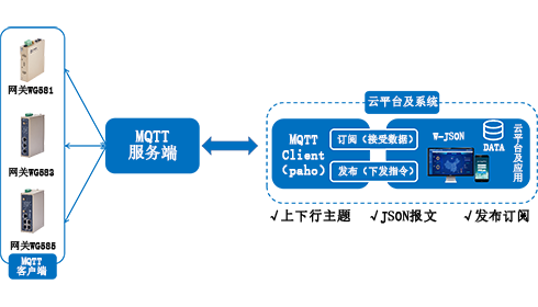 網關內嵌MQTT客戶端,它建立與部署在服務器上的MQTT Broker的雙向通信鏈路;同時客戶自行開發的云平臺(或本地軟件)也是通過MQTT客戶端來和MQTT Broker來實現訂閱和發布數據的雙向通信。