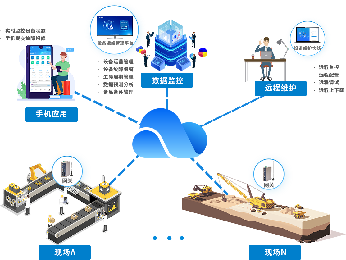 物通博聯(lián)針對(duì)設(shè)備制造商的裝備數(shù)字化需求,構(gòu)建了“終端數(shù)據(jù)采集-多網(wǎng)融合傳輸-云端智能運(yùn)維-遠(yuǎn)程協(xié)同服務(wù)”的全周期技術(shù)解決方案:以工業(yè)智能網(wǎng)關(guān)為核心,采集裝備運(yùn)行參數(shù)、運(yùn)行狀態(tài)等數(shù)據(jù),通過(guò) 5G/4G/WiFi/ 以太網(wǎng)等方式將標(biāo)準(zhǔn)化數(shù)據(jù)實(shí)時(shí)上傳至設(shè)備運(yùn)維管理平臺(tái)。平臺(tái)借大數(shù)據(jù)分析與故障診斷算法,實(shí)現(xiàn)數(shù)據(jù)監(jiān)控、趨勢(shì)預(yù)測(cè)與異常識(shí)別,設(shè)備存故障風(fēng)險(xiǎn)時(shí)自動(dòng)觸發(fā)預(yù)警。依托設(shè)備維護(hù)快線,可遠(yuǎn)程完成程序上下載、參數(shù)調(diào)試等操作,提升維護(hù)效率、降低運(yùn)維成本,助力設(shè)備制造商實(shí)現(xiàn)裝備全生命周期數(shù)字化管理。