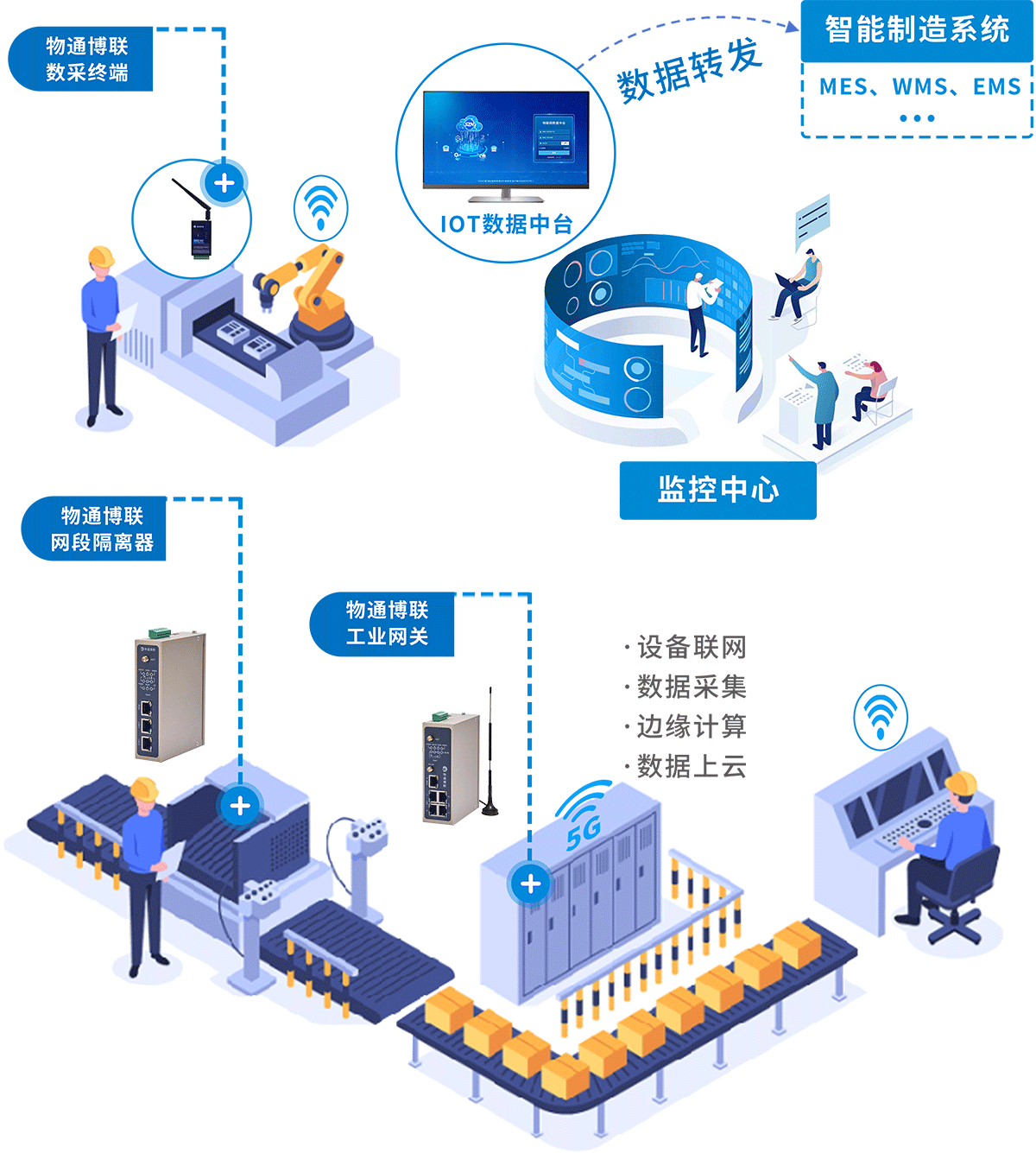 物通博聯聚焦工廠數字化轉型,構建 “邊緣接入 - 數據處理 - 應用落地” 技術體系:以工業智能網關、數采終端等邊緣硬件,接入工廠生產設備、能耗設備、安防監控設備,解析異構協議并做邊緣預處理。再將標準化數據上傳至物聯云平臺與 MES 系統,同時依托 IOT 數據中臺實現數據資產化管理,支撐設備監控、能耗分析、生產可視化等應用。最終打通 “設備 - 數據 - 業務” 鏈路,助力工廠完成生產運營數字化升級,為柔性生產、預測性維護等新業務提供技術底座。