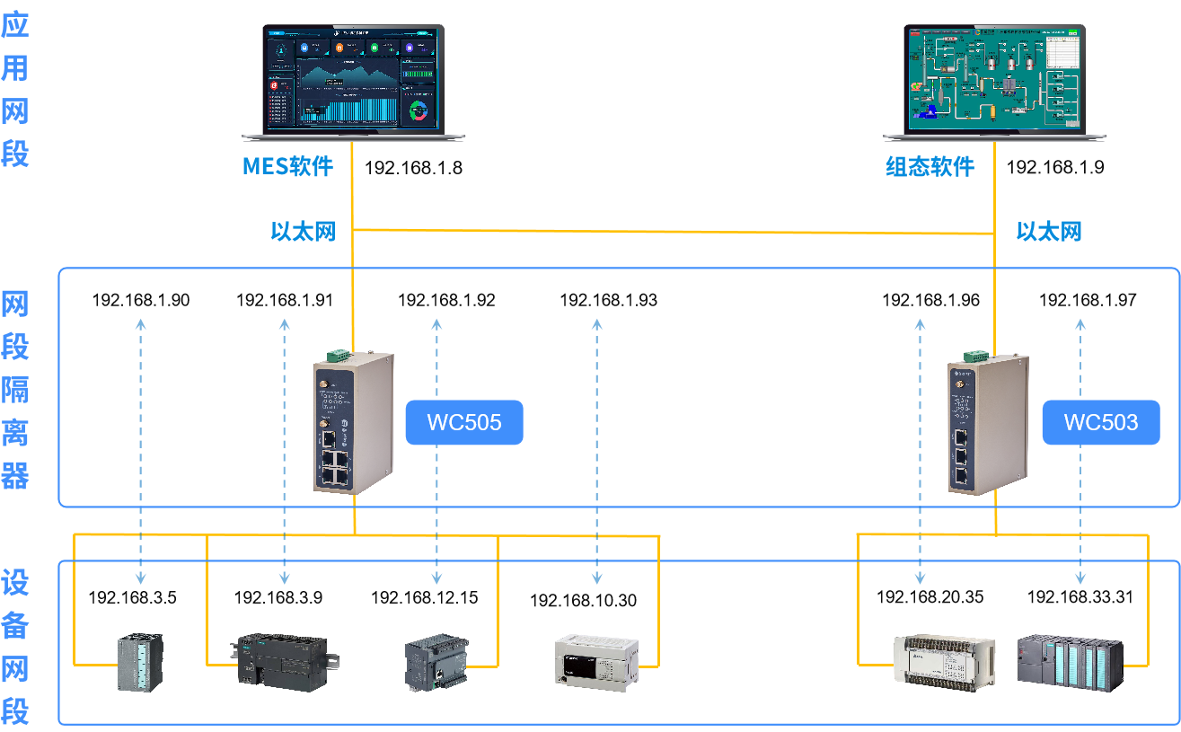 物通博聯WC系列網段隔離器適用于生產網絡對 PLC、HMI、CNC、DCS、MES等網絡通訊和數據采集,兼有跨網段隔離和IP轉換的功能。車間多個設備,如果有不同網段的IP地址,則可以統一成同一網段的IP地址,進行設備(PLC、CNC)的在線編程、數據采集、遠程管理等各種跨網段訪問。