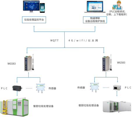 物通博聯(lián)工業(yè)智能網(wǎng)關(guān)WG583與餐廚垃圾處理設(shè)備進行通訊,可以將設(shè)備的運行狀態(tài)、工作參數(shù)等數(shù)據(jù)采集到網(wǎng)關(guān)上,進行解析并上報到云端。